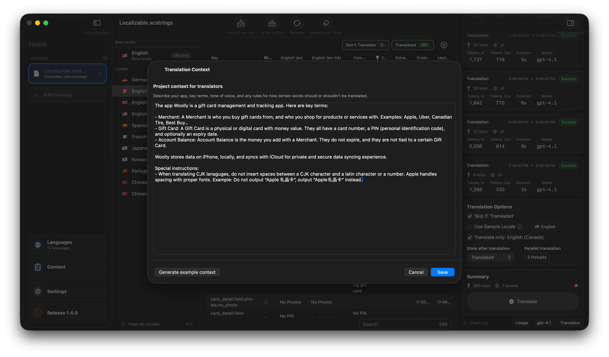 - It allows me to specify a “context” for LLM. I can add a basic intro to my app, list key terms, and add specific instructions. For example, I asked LLM to not insert a space between CJK characters and Latin/number characters, as spacing is handled by iOS text rendering. The generated results perfectly follows my instructions after I added this prompt.