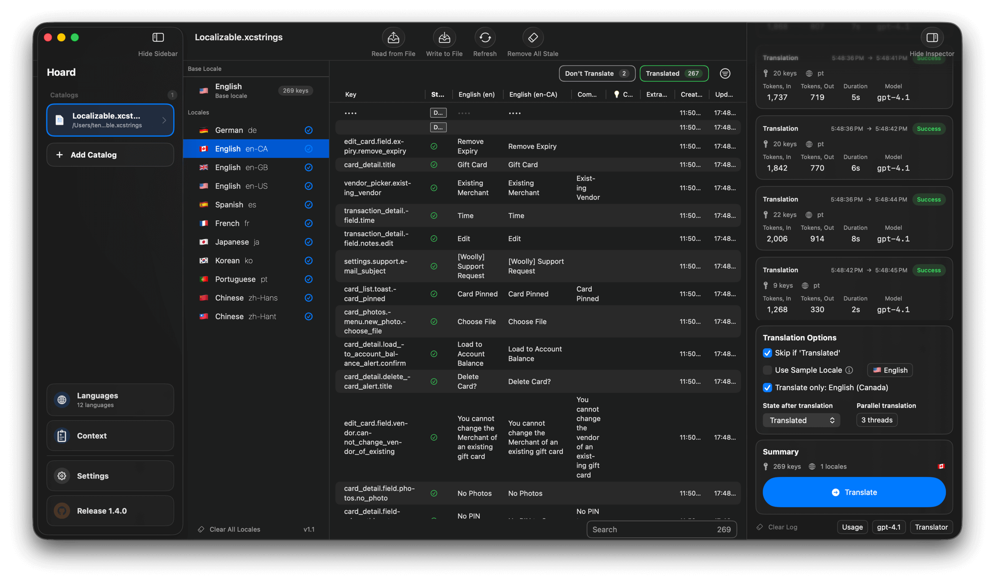 XCStrings Buddy: AI Translator — opens XCStrings file OK, and works as intended. The developer threw me 1,000 free credits to use, but I burnt through all of them halfway localizing my app Woolly into Traditional Chinese. Another 1,000 credits would cost CA$8, and I could get a roughly 50% discount by buying bulk, getting 10,000 credits for CA$35. In comparison, I localized Woolly into 6 languages, and added UK, US, Canadian English variants, and OpenAI charged me roughly $2.